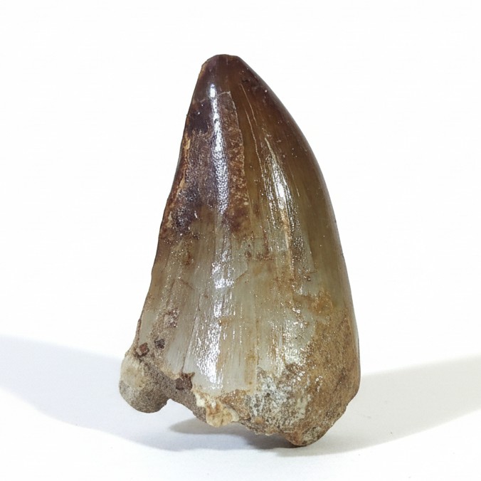 This is a 1.9″ Prehistoric fossil MOSASAUR Tooth (Prognathodon Anceps.) Big species of Mosasaurid sourced from the Late Cretaceous phosphate deposits within the Sidi Chennane Basin of Morocco. Renowned for its exceptional preservation, this tooth is a prized specimen for collectors and buyers alike.