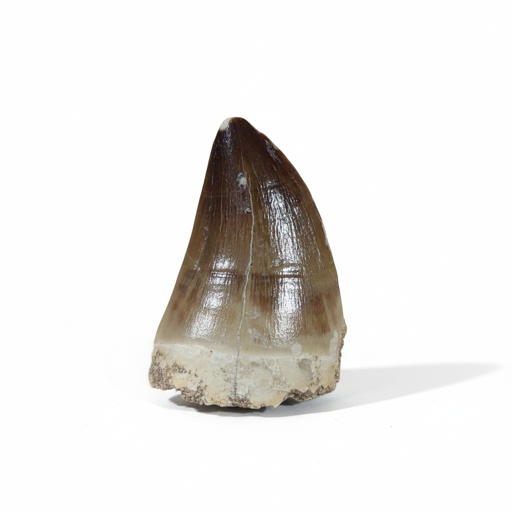 This is a high-quality 2.36″ fossil MOSASAUR Tooth (Prognathodon Anceps.) tooth Big species of Mosasaurus sourced from the Late Cretaceous phosphate deposits within the Oulad Abdoun Basin of Morocco. Renowned for its exceptional preservation, this tooth is a prized specimen for collectors and buyers alike.