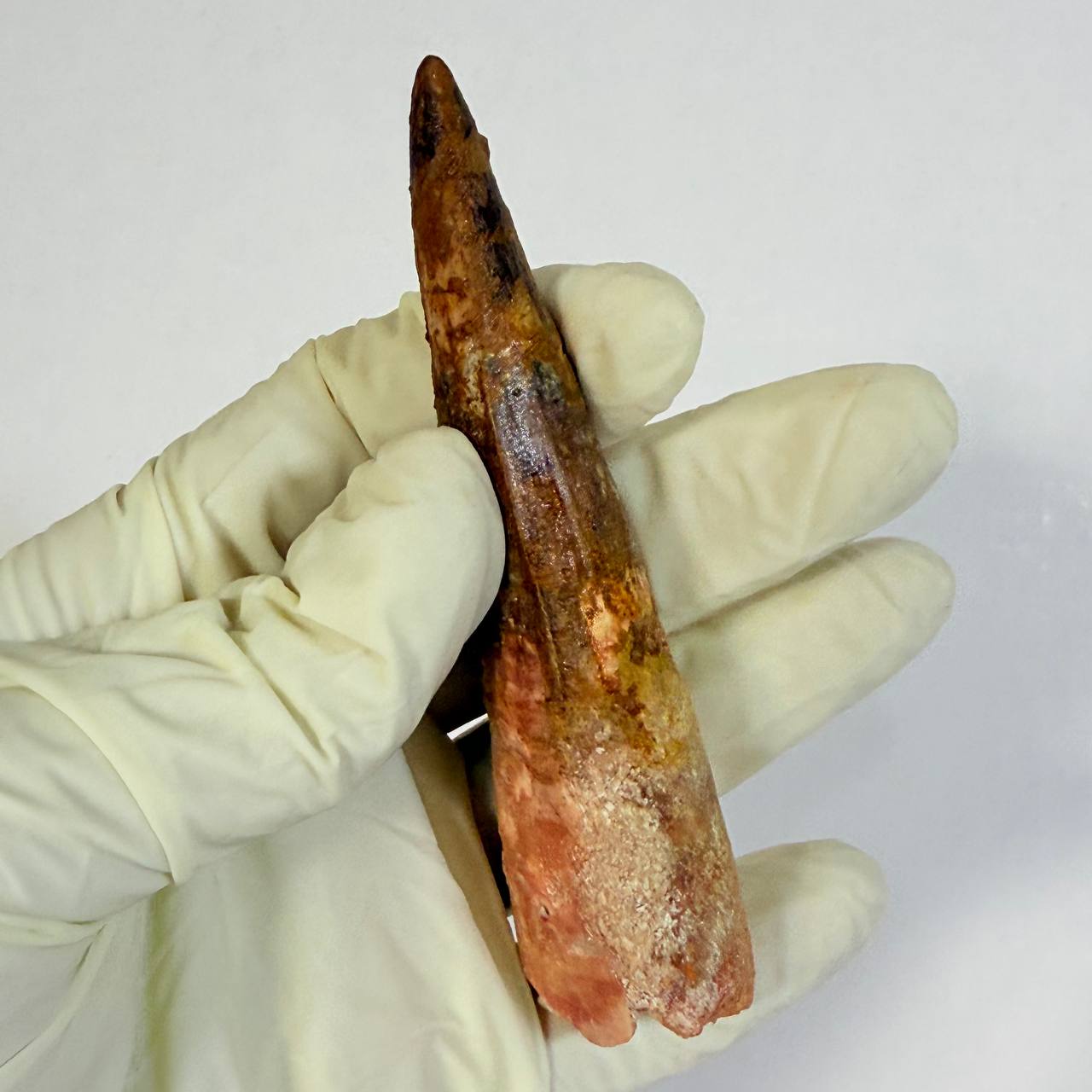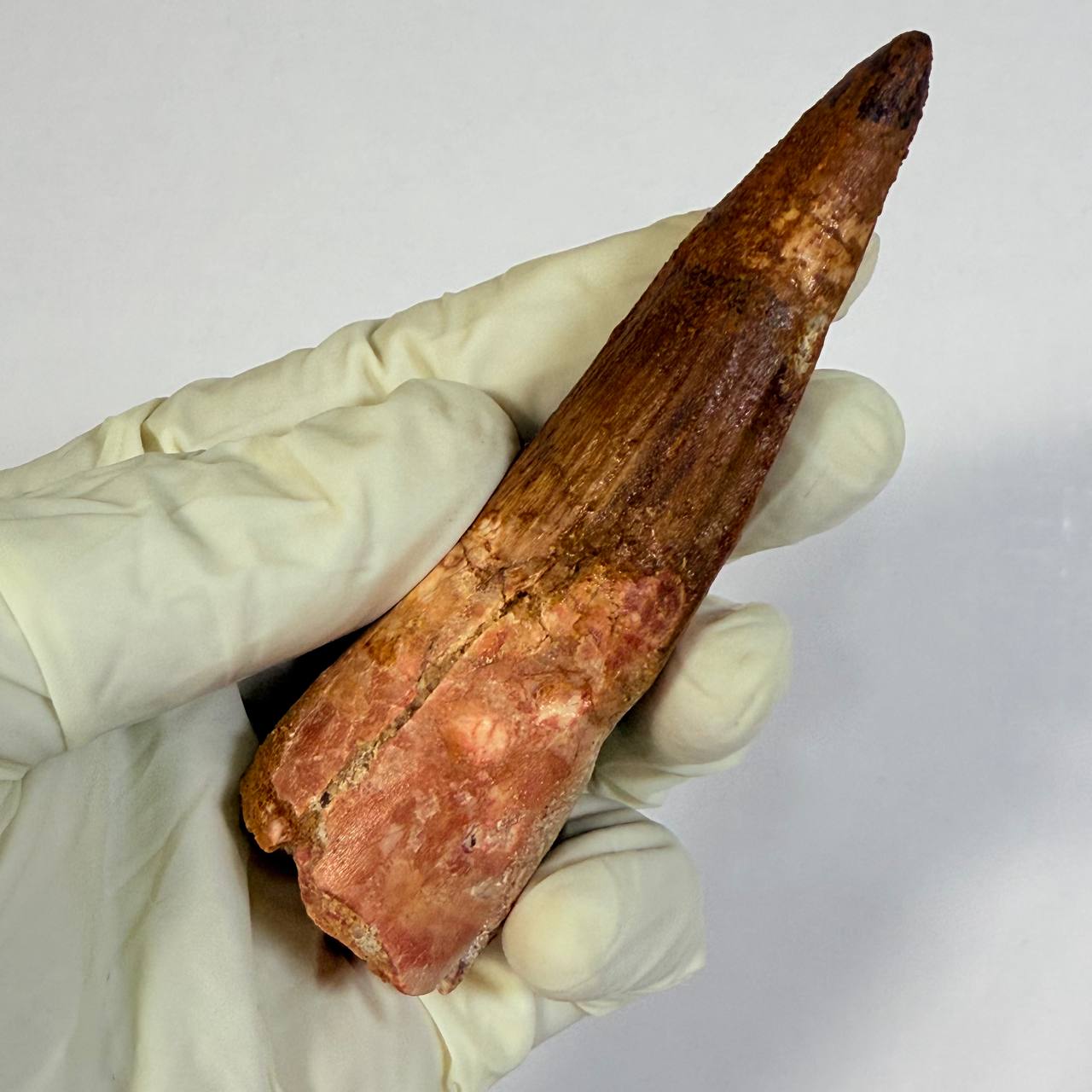 This is a GENUINE fossil Spinosaurus dinosaur tooth. This tooth is complete with beautiful, rich colors, excellent enamel, and luster. While there is a single repair and crack-filling near the tip, the tooth is otherwise in superb preservation. This fossil once graced the powerful jaws of a Spinosaurus aegyptiacus, a dinosaur that thrived in the swampy regions of what is now the northwest Sahara Desert.
