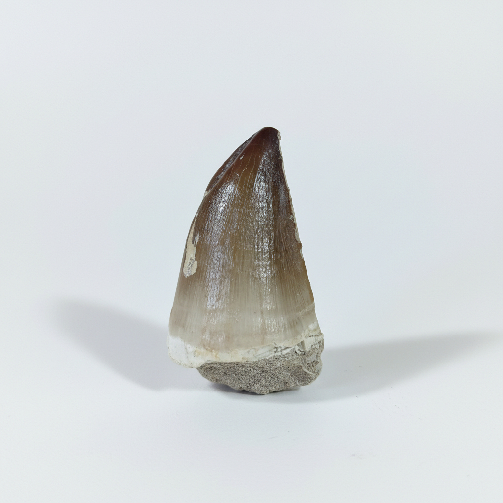 This is a high-quality 2.1″ fossil MOSASAUR Tooth (Prognathodon Anceps.) tooth Big species of Mosasaurus sourced from the Late Cretaceous phosphate deposits within the Oulad Abdoun Basin of Morocco. Renowned for its exceptional preservation, this tooth is a prized specimen for collectors and buyers alike.