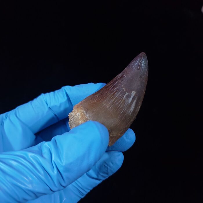 This is a 2.1″ fossil MOSASAUR Tooth (Prognathodon Anceps.) Big species of Mosasaurid sourced from the Late Cretaceous phosphate deposits within the Sidi Chennane Basin of Morocco. Renowned for its exceptional preservation, this tooth is a prized specimen for collectors and buyers alike.
