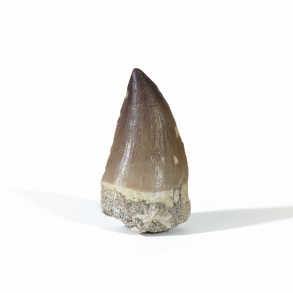 This is a 1.9″ High-quality MOSASAUR Tooth Fossilized (Prognathodon Anceps.) Big species of Mosasaurid sourced from the Late Cretaceous phosphate deposits within the Sidi Chennane Basin of Morocco. Renowned for its exceptional preservation, this tooth is a prized specimen for collectors and buyers alike.