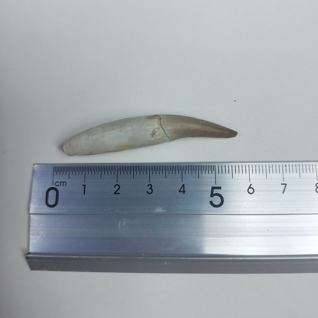 This 2.3-inch fossilized tooth belonged to a Late Cretaceous plesiosaur species, specifically Zarafasaura oceanis. Researchers discovered it in the phosphate deposits of the Oulad Abdoun Basin in Morocco.