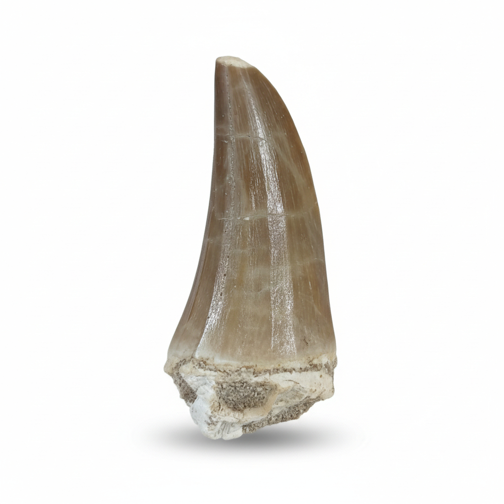 this is a Prehistoric Tylosaurus Fossil tooth measuring 2.36 inches discovered a in the Sidi Chennane Basin, Morocco, is a significant find in the realm of paleontology. Tylosaurus is a genus of large marine reptiles belonging to the mosasaur family, which thrived during the Late Cretaceous period, approximately 89 to 65 million years ago.
