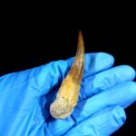 This 2.6-inch fossilized tooth belonged to a Late Cretaceous plesiosaur species, specifically Zarafasaura oceanis. Researchers discovered it in the phosphate deposits of the Oulad Abdoun Basin in Morocco.