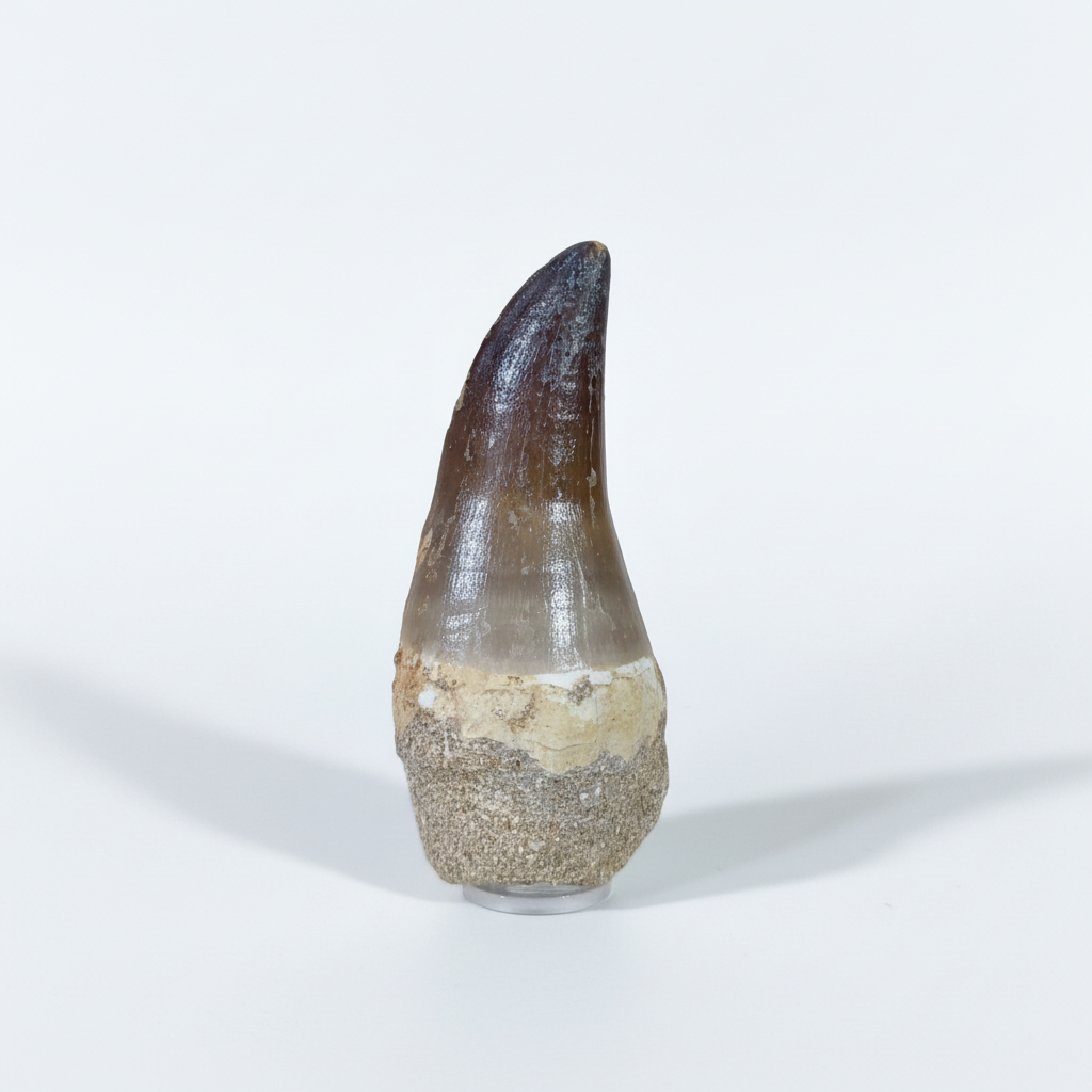 This is a high-quality 2.6″ fossil MOSASAUR Tooth (Prognathodon Anceps.) tooth Big species of Mosasaurus sourced from the Late Cretaceous phosphate deposits within the Oulad Abdoun Basin of Morocco. Renowned for its exceptional preservation, this tooth is a prized specimen for collectors and buyers alike.