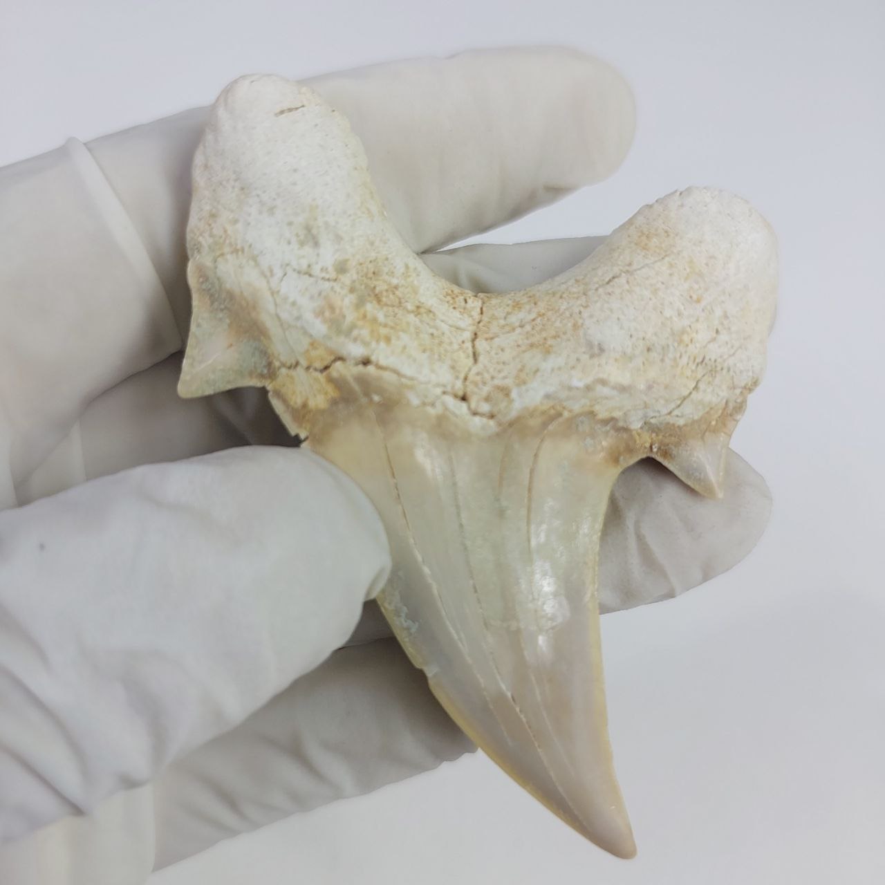 This Original fossil specimen Otodus tooth from the extinct mackerel shark, Otodus obliquus, originating from the Eocene era around 54 million years ago. It was unearthed from the phosphate deposits of Khouribga, Morocco, where extensive mining operations frequently yield fossils. Despite the abundance of Otodus teeth in these mines, intact, large specimens like this one are rare due to the equipment used in mining, which often damages or fragments them. Additionally, Otodus belongs to the Lamniformes family, which includes renowned shar ks like the Great White and the colossal Megalodon. Enthusiasts and collectors of shark teeth greatly value such finds, especially those from historically rich sites like Khouribga, for their rarity, beauty, and scientific significance.