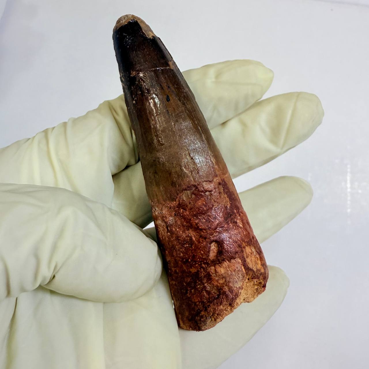 This is a GENUINE fossil Spinosaurus dinosaur tooth. This tooth is complete with beautiful, rich colors, excellent enamel, and luster. While there is a single repair and crack-filling near the tip, the tooth is otherwise in superb preservation. This fossil once graced the powerful jaws of a Spinosaurus aegyptiacus, a dinosaur that thrived in the swampy regions of what is now the northwest Sahara Desert.