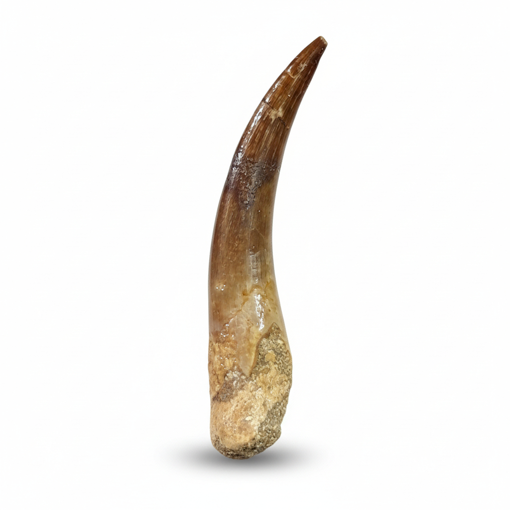 This 2.01-inch fossilized tooth belonged to a Late Cretaceous plesiosaur species, specifically Zarafasaura oceanis. Researchers discovered it in the phosphate deposits of the Oulad Abdoun Basin in Morocco.