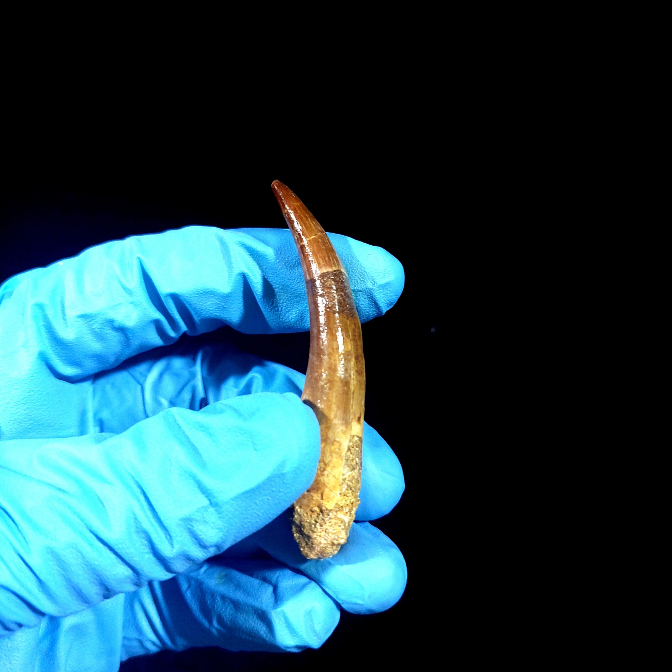 This 2.01-inch fossilized tooth belonged to a Late Cretaceous plesiosaur species, specifically Zarafasaura oceanis. Researchers discovered it in the phosphate deposits of the Oulad Abdoun Basin in Morocco.
