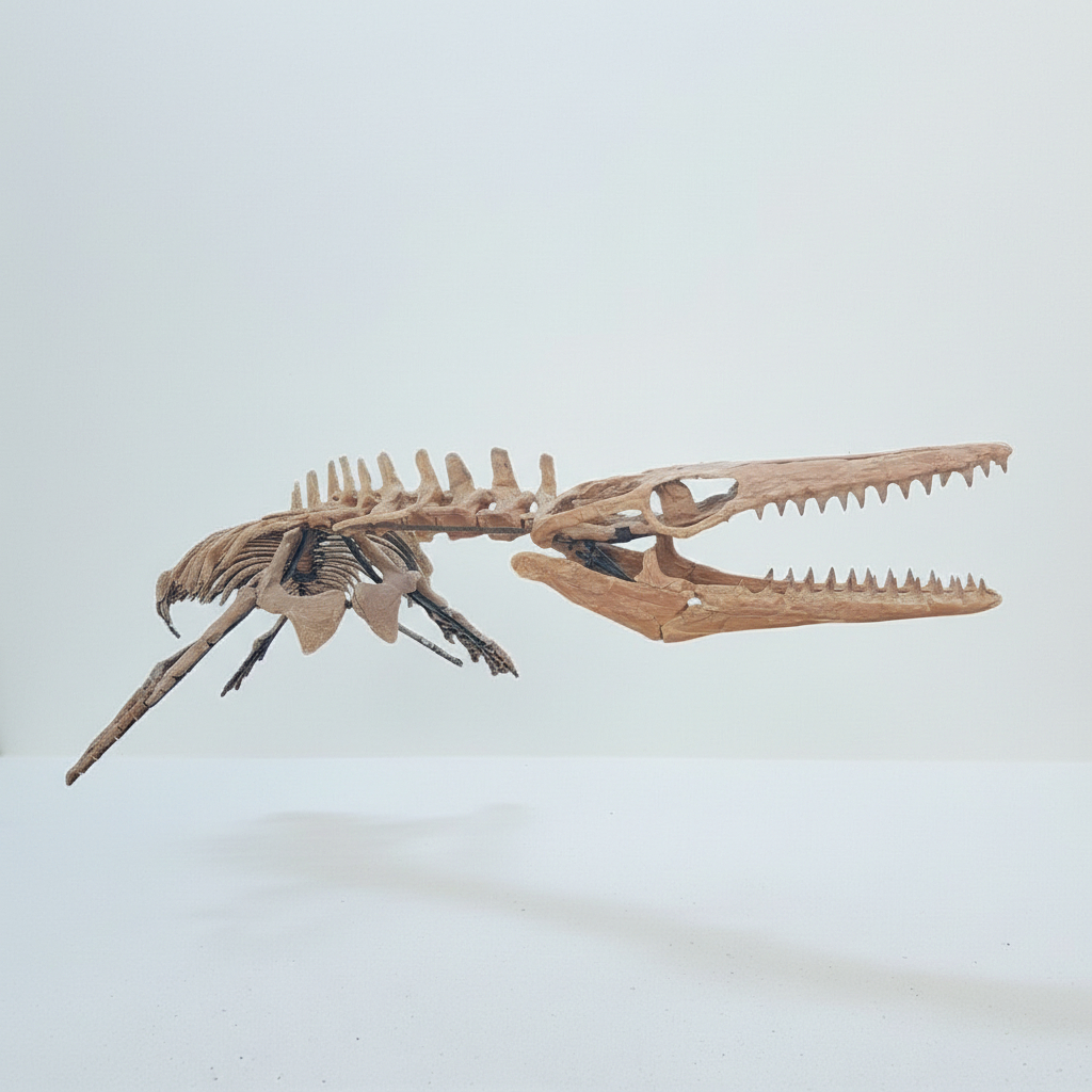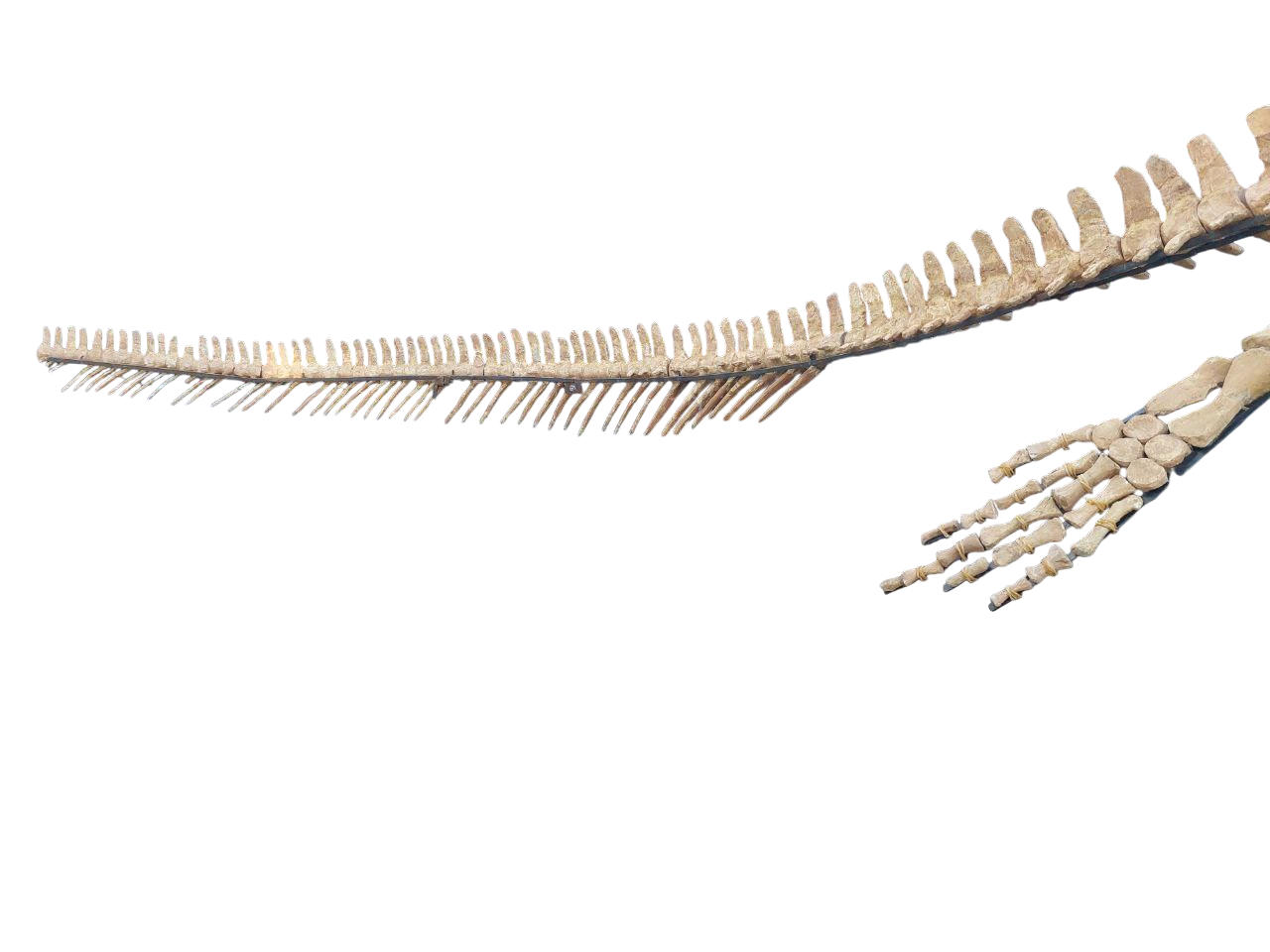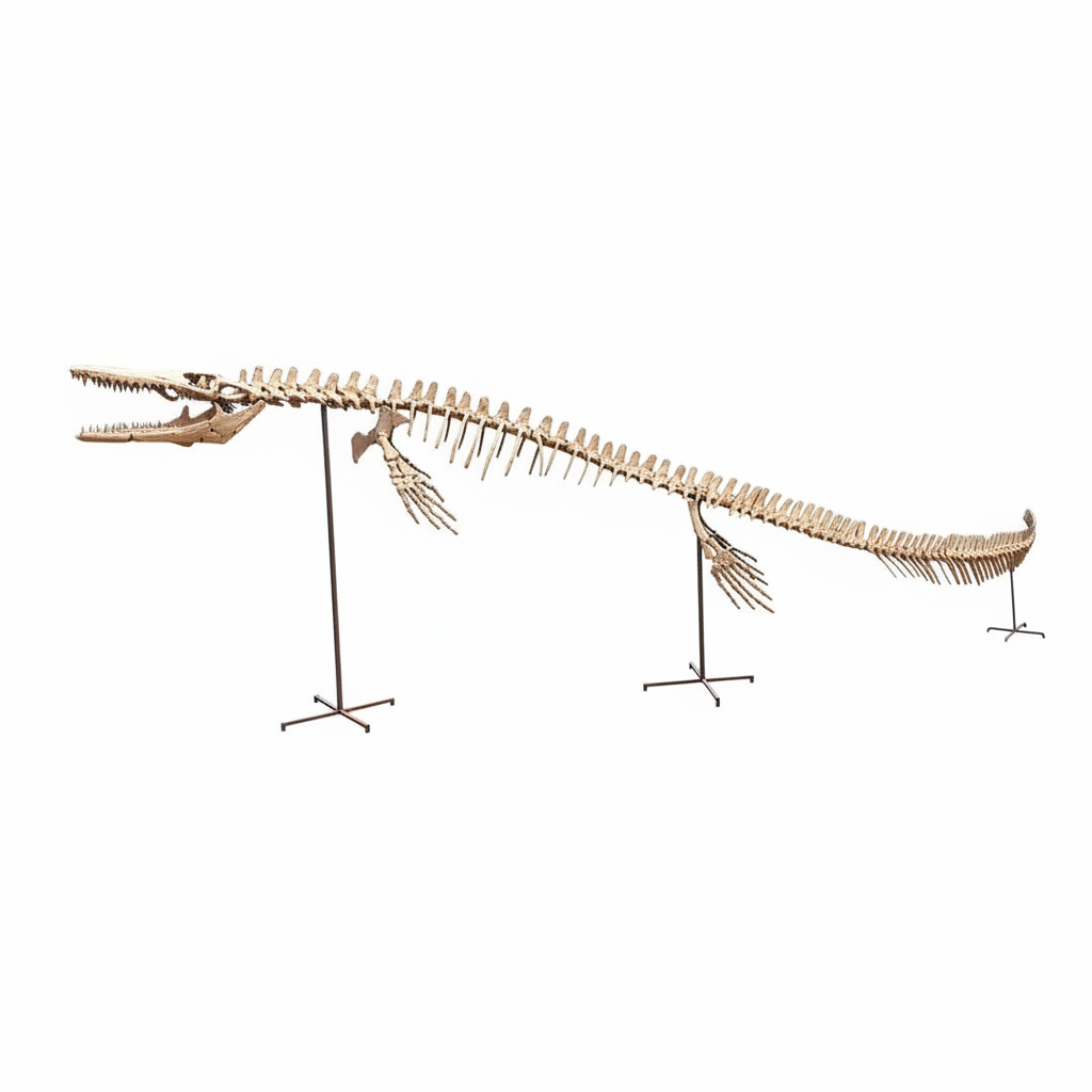 This stunning Mosasaurus skeleton is an extraordinary specimen of Late Cretaceous marine life, spanning 507cm (197 inches or approximately 16.5 feet) in length. Meticulously prepared, it offers an authentic glimpse into the life of these iconic marine reptiles, which roamed the oceans approximately 70–66 million years ago.