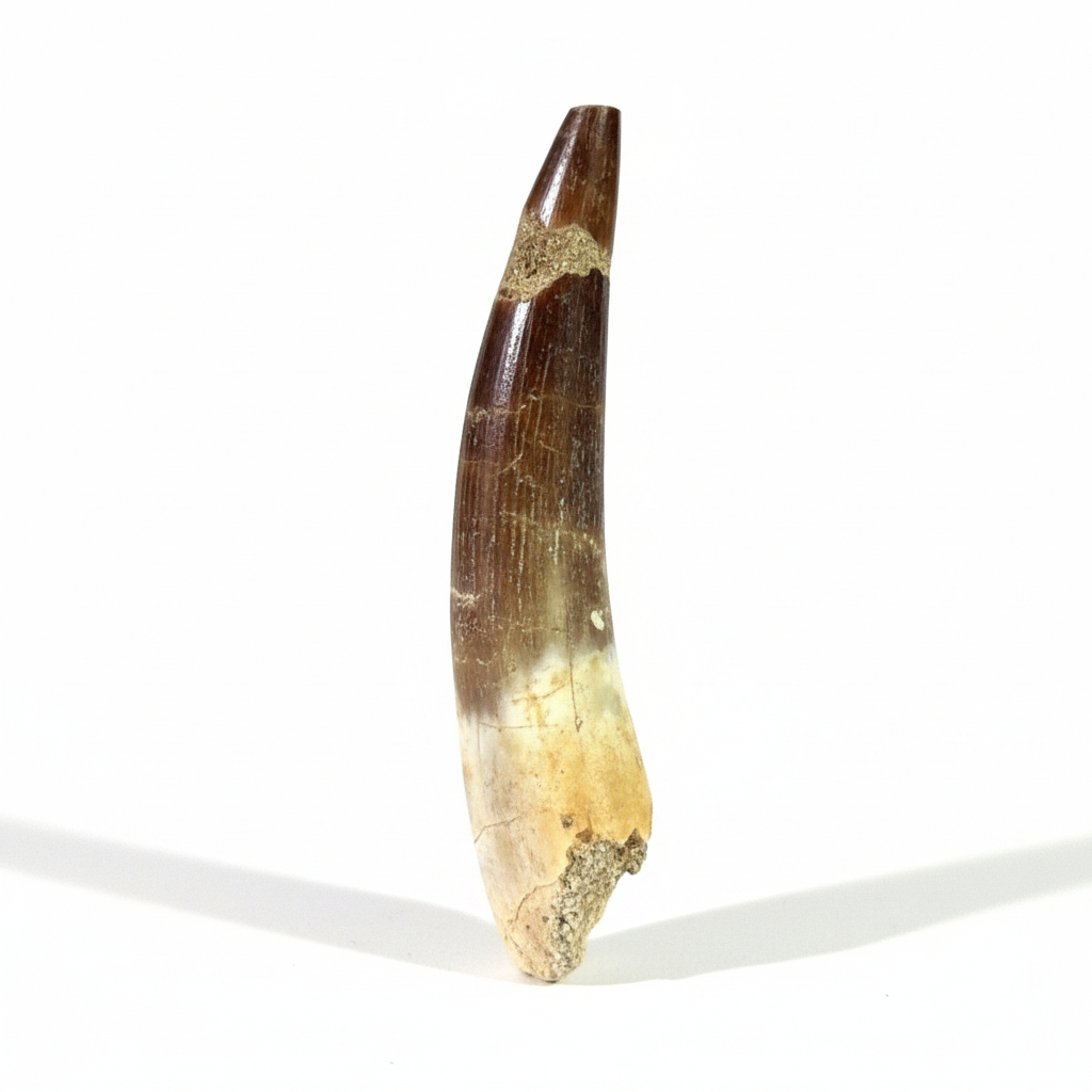 This 2.6-inch fossilized tooth belonged to a Late Cretaceous plesiosaur species, specifically Zarafasaura oceanis. Researchers discovered it in the phosphate deposits of the Oulad Abdoun Basin in Morocco.