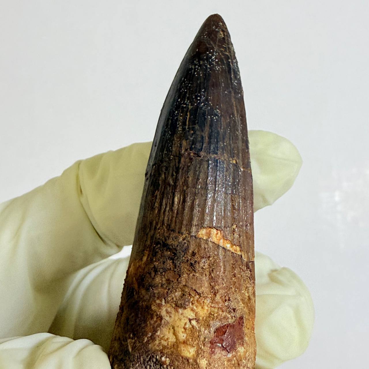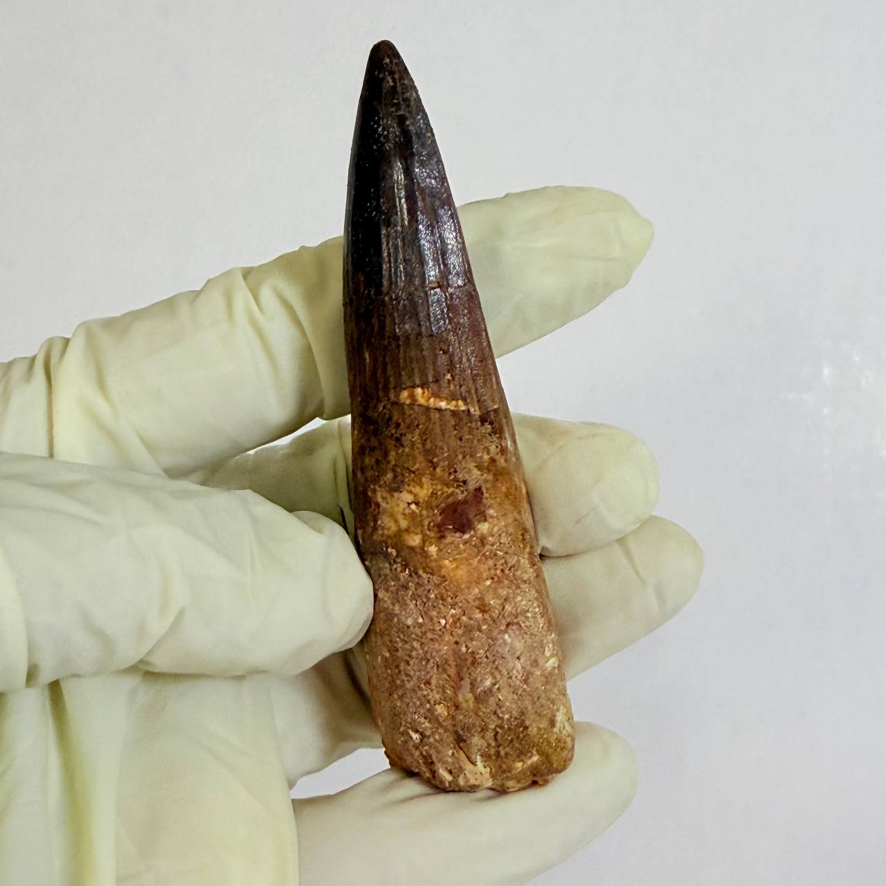 This is a GENUINE fossil Spinosaurus dinosaur tooth. This tooth is complete with beautiful, rich colors, excellent enamel, and luster. While there is a single repair and crack-filling near the tip, the tooth is otherwise in superb preservation. This fossil once graced the powerful jaws of a Spinosaurus aegyptiacus, a dinosaur that thrived in the swampy regions of what is now the northwest Sahara Desert.
