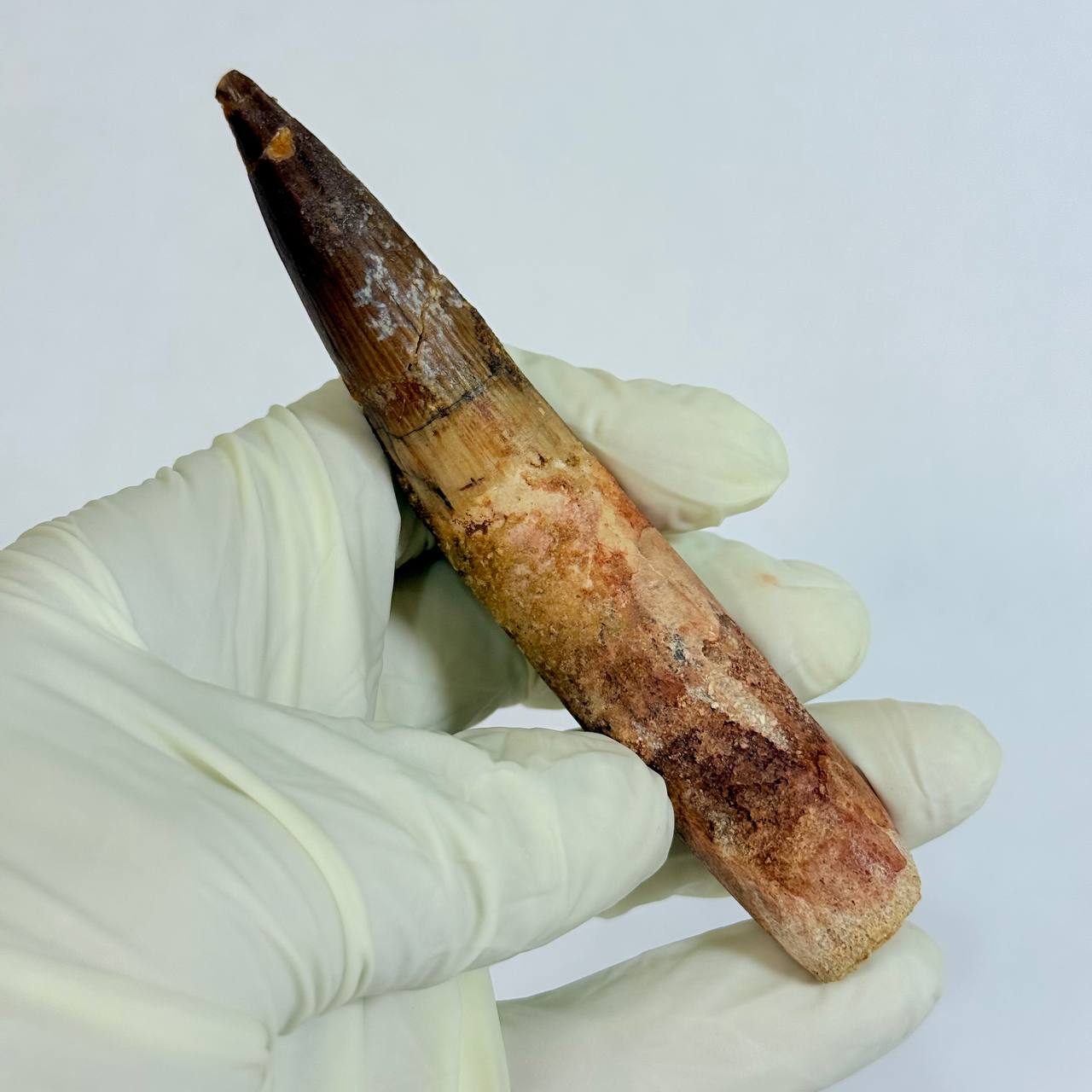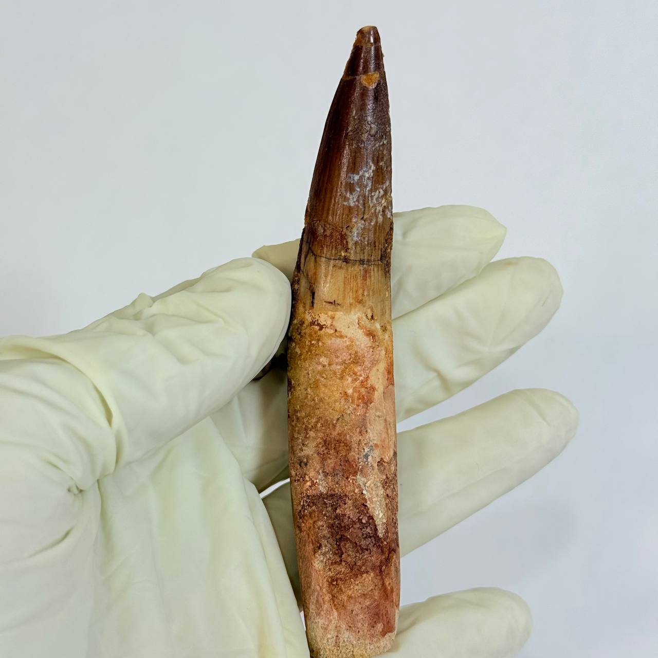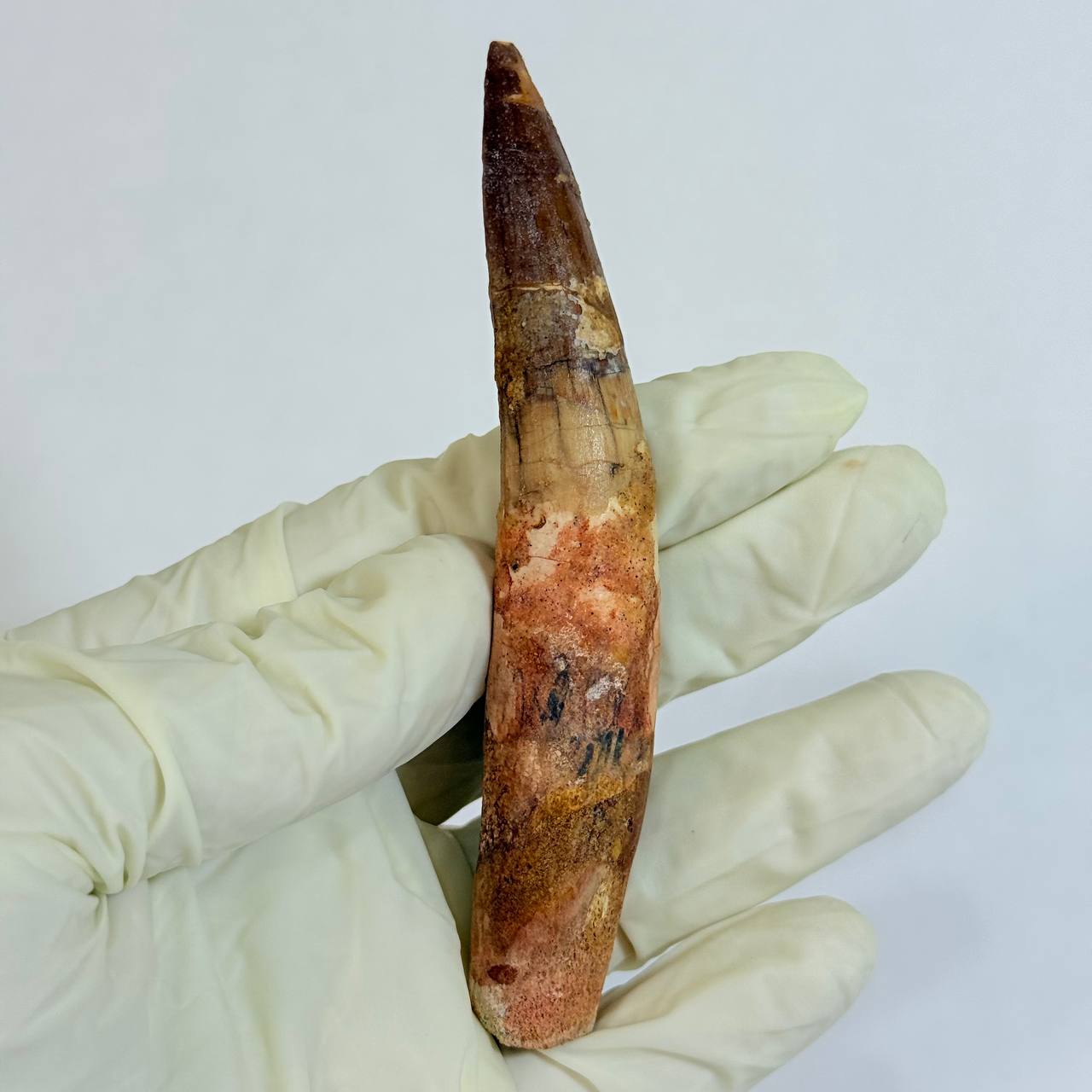 This is a GENUINE fossil Spinosaurus dinosaur tooth. This tooth is complete with beautiful, rich colors, excellent enamel, and luster. While there is a single repair and crack-filling near the tip, the tooth is otherwise in superb preservation. This fossil once graced the powerful jaws of a Spinosaurus aegyptiacus, a dinosaur that thrived in the swampy regions of what is now the northwest Sahara Desert.