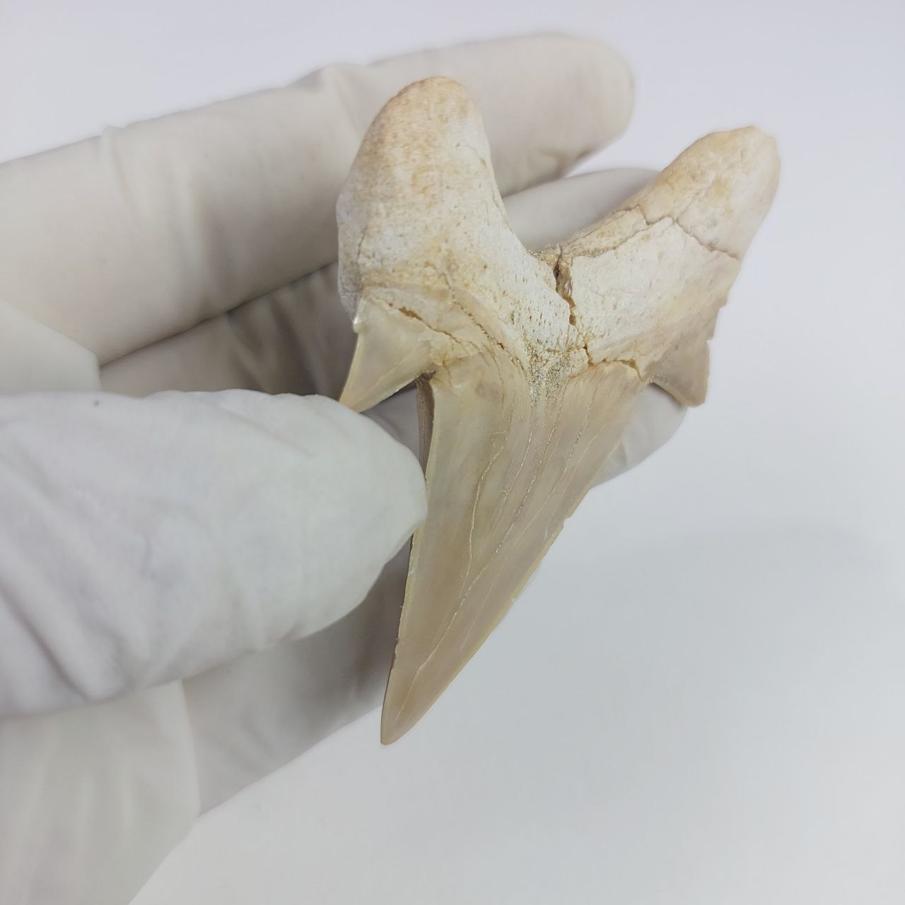 This Original Shark Tooth Fossil specimen Otodus tooth from the extinct mackerel shark, Otodus obliquus, originating from the Eocene era around 54 million years ago. It was unearthed from the phosphate deposits of Khouribga, Morocco, where extensive mining operations frequently yield fossils. Despite the abundance of Otodus teeth in these mines, intact, large specimens like this one are rare due to the equipment used in mining, which often damages or fragments them. Additionally, Otodus belongs to the Lamniformes family, which includes renowned shar ks like the Great White and the colossal Megalodon. Enthusiasts and collectors of shark teeth greatly value such finds, especially those from historically rich sites like Khouribga, for their rarity, beauty, and scientific significance.