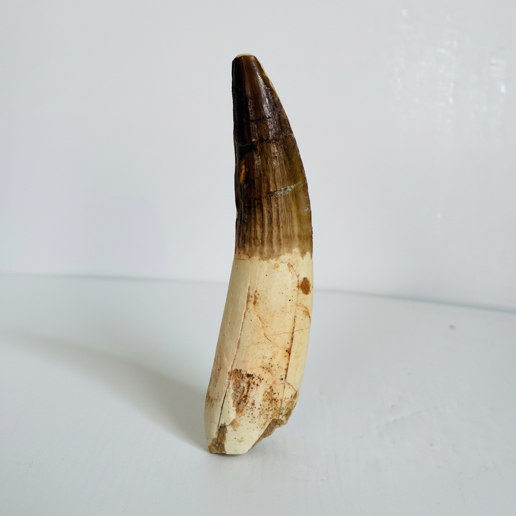 From the start, its elongated conical shape and natural enamel texture clearly reflect its role as a powerful Cretaceous hunter.