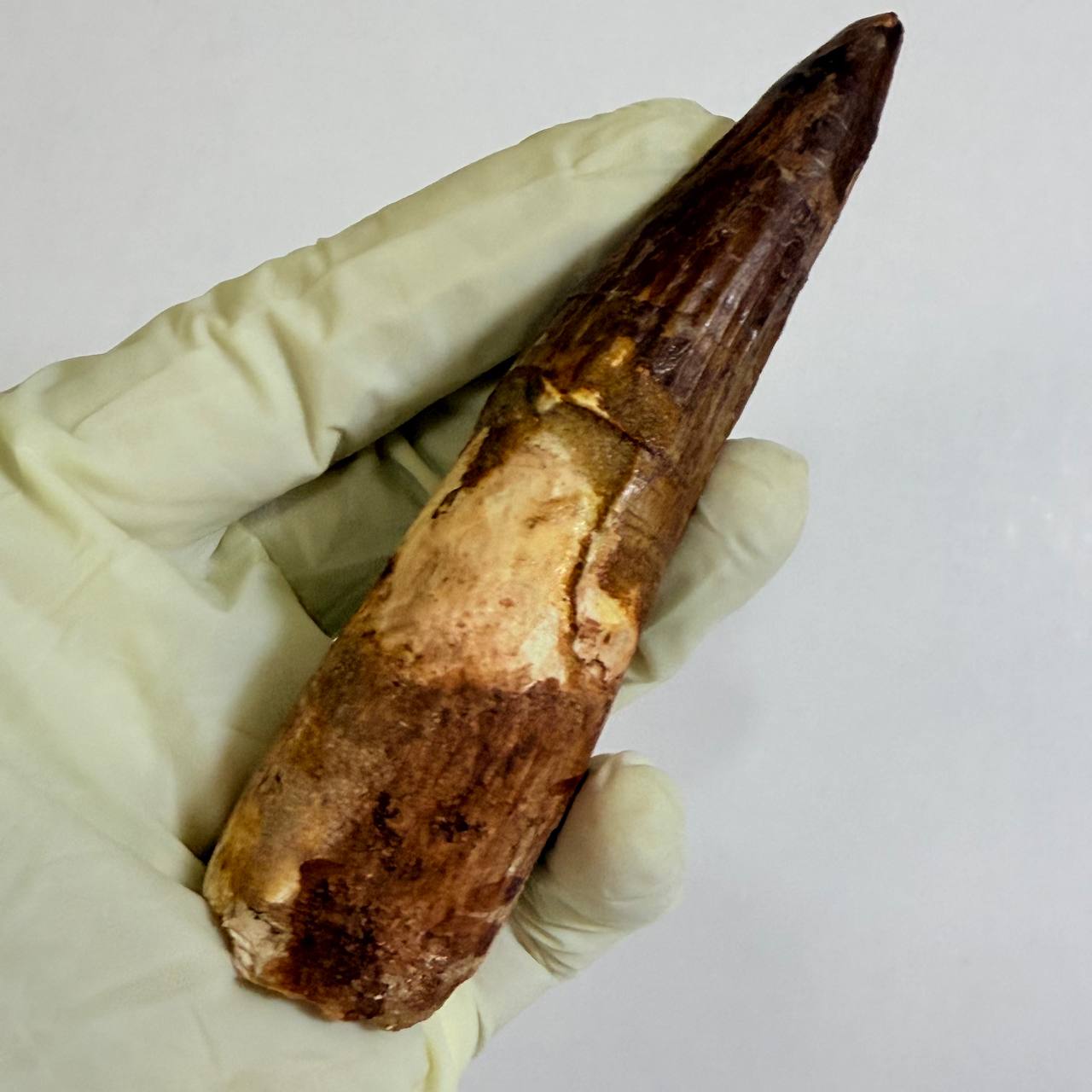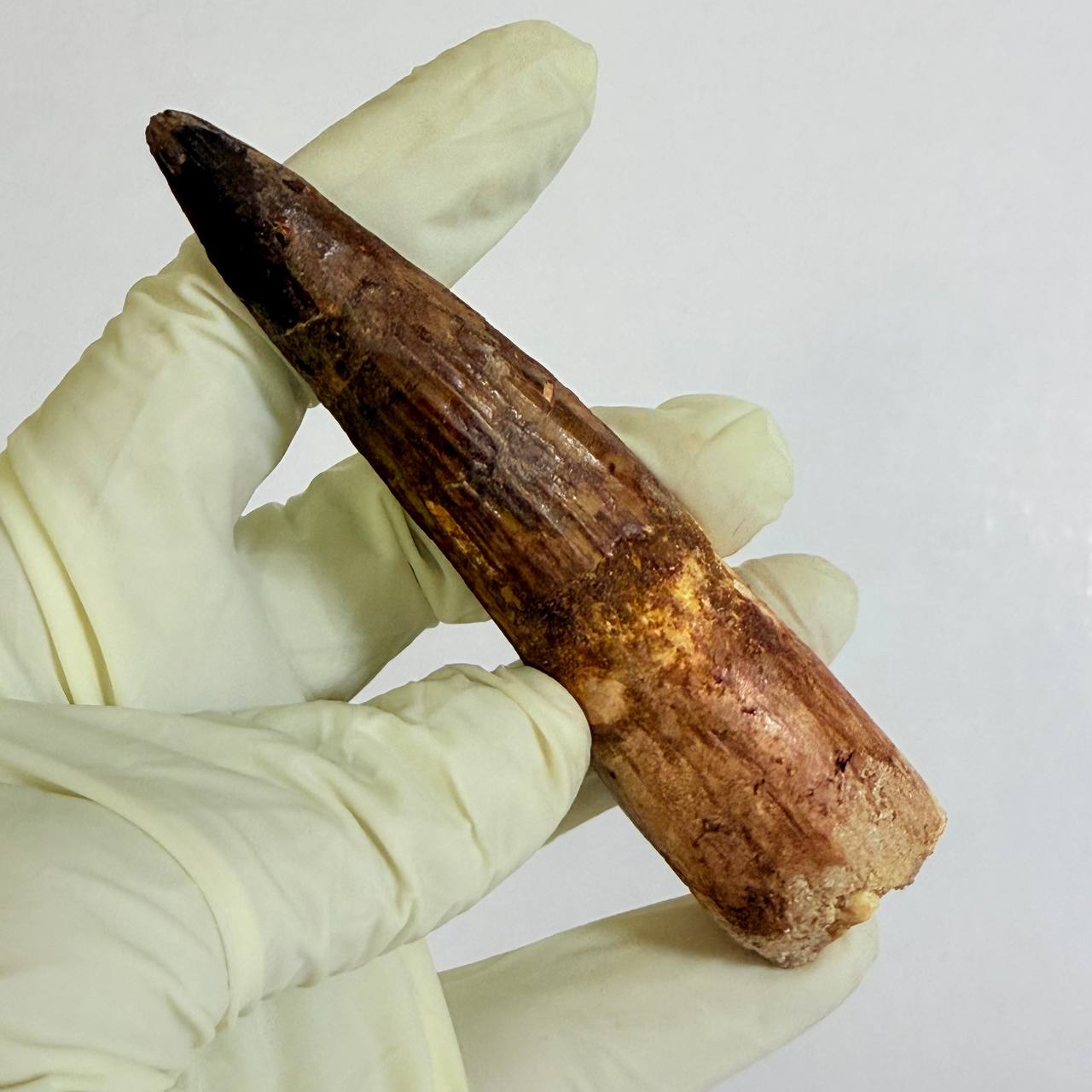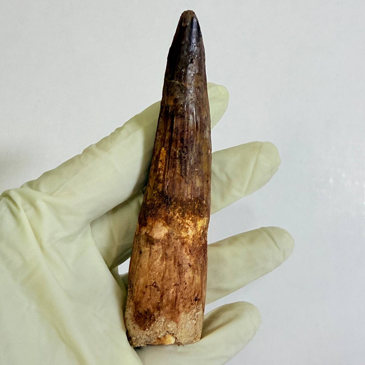 This is a GENUINE fossil Spinosaurus dinosaur tooth. This tooth is complete with beautiful, rich colors, excellent enamel, and luster. While there is a single repair and crack-filling near the tip, the tooth is otherwise in superb preservation. This fossil once graced the powerful jaws of a Spinosaurus aegyptiacus, a dinosaur that thrived in the swampy regions of what is now the northwest Sahara Desert.